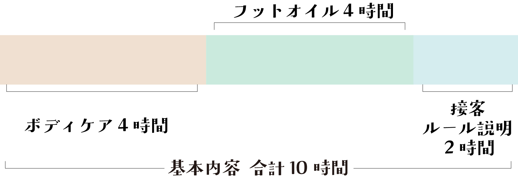 ボディケア4時間、フットオイル4時間、接客・ルール2時間の計10時間をかけ、プロの基礎を固めます。講師と1対1なので、周りを気にせず質問できるのが魅力。確かな自信を持って、お客様の前に立つことができます。
