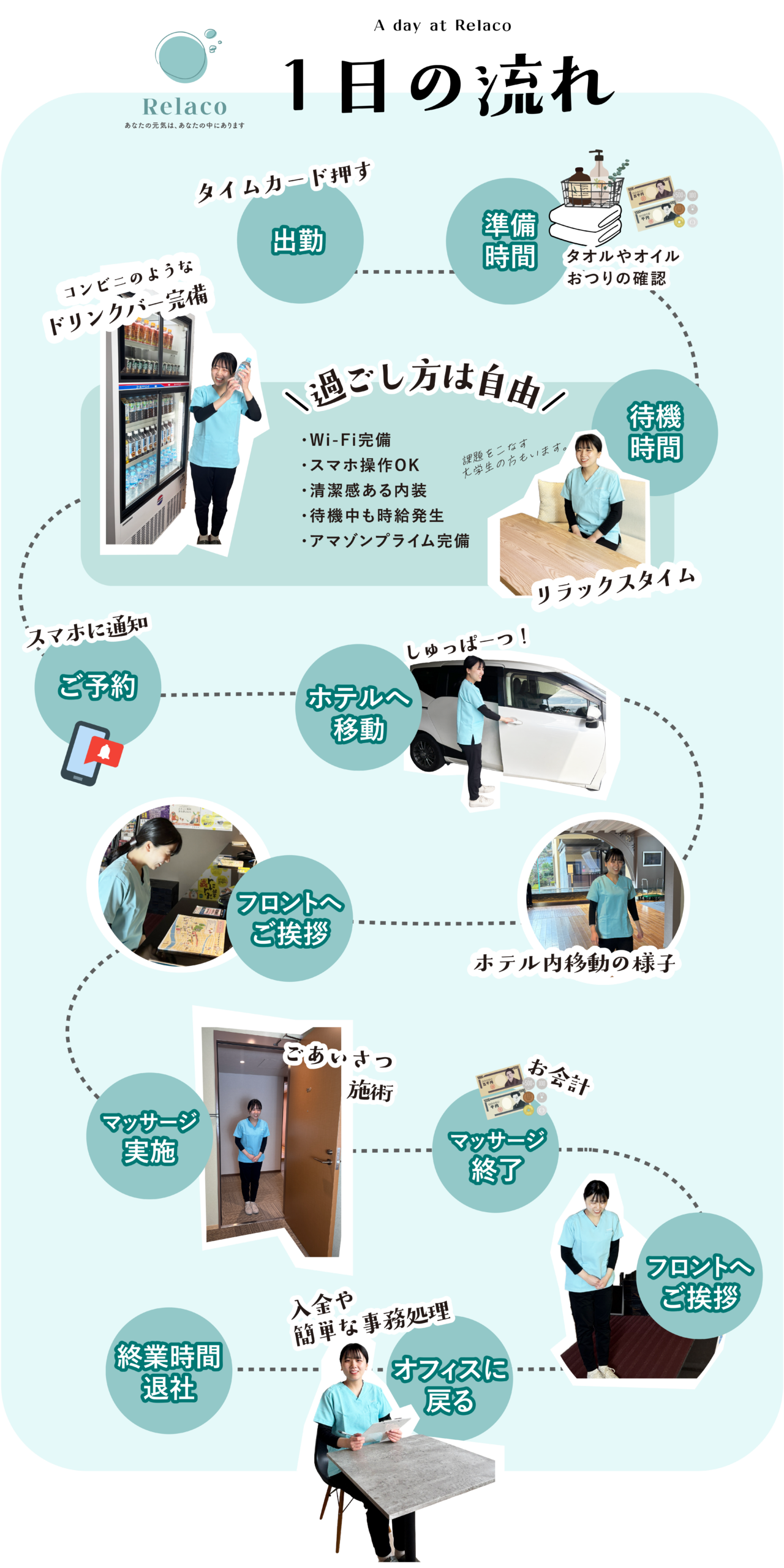 「昼間の仕事と両立したい」「家事が落ち着いた夜の時間を有効活用したい」 Relacoは、そんな30〜50代の男女スタッフが活躍しております。 始業は19時からのためダブルワークや家庭との両立がしやすく、短時間でもプロとしてのやりがいを感じられる環境です。 研修制度が充実しているため、特別な経験は必要ありません。 未経験の方でもプロのセラピストとして自信を持ってデビューが実現します。